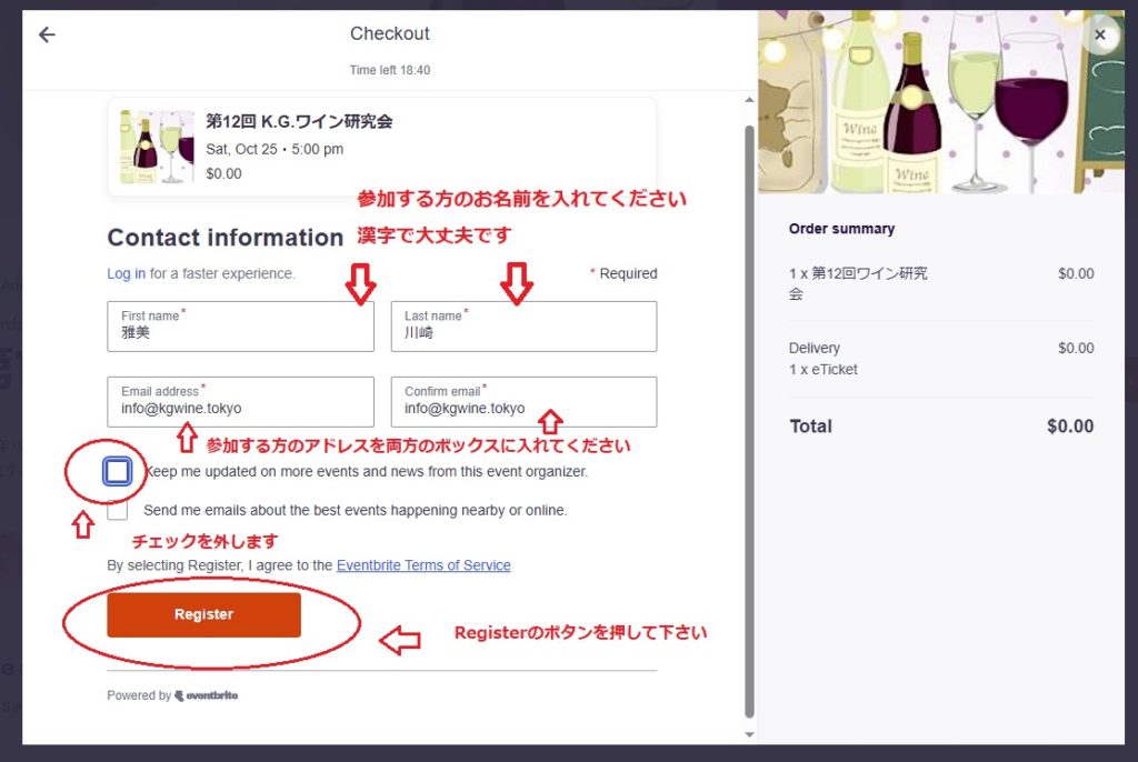 4.下記のような画面が表示されるので、参加する方のお名前とメールアドレスを2カ所に入力します